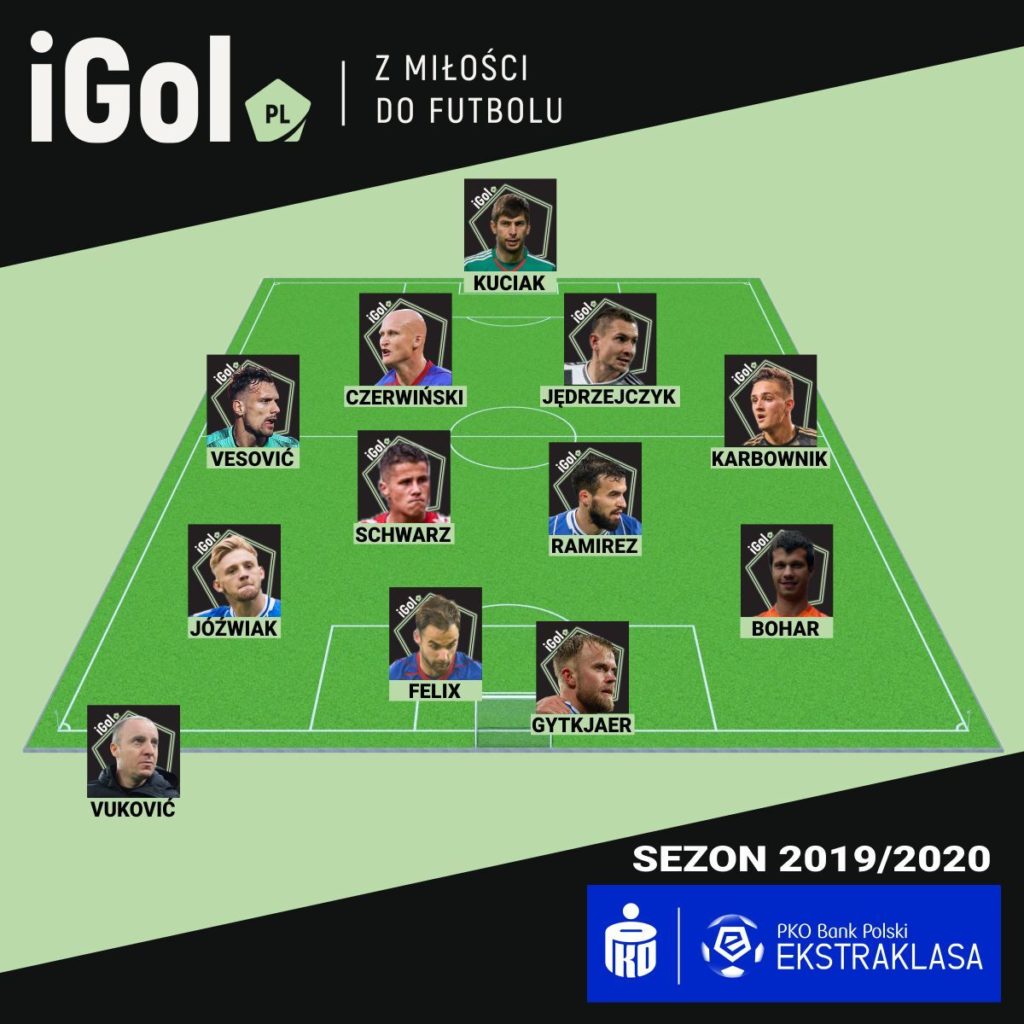 Tak samo jak w rundzie jesiennej znalazło się miejsce w naszym zestawieniu dla młodzieżowców, tylko że tym razem mamy ich dwóch, a po półmetku rozgrywek był tylko jeden. Postanowiliśmy również wybrać trenera sezonu 2019/2020 naszej ligi, jego wybór był oczywisty i raczej zasłużony. Zapraszamy zatem na prezentację naszej jedenastki i trenera sezonu PKO Ekstraklasy.