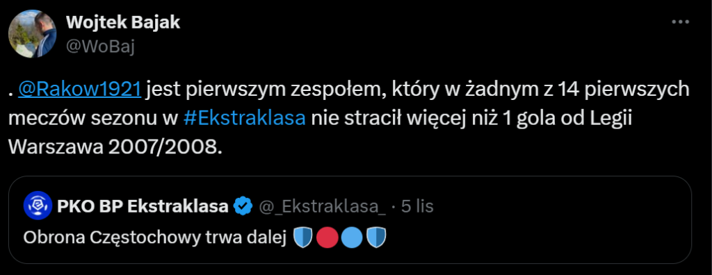 – Przypomnijmy sobie wywiad z Dawidem Szwargą, kiedy był jeszcze asystentem podczas poprzedniej kadencji trenera Papszuna. Stwierdził on, że Raków broni pola karnego najlepiej w Europie. I wiadomo, brzmiało to śmieszenie, ale fakty były takie, że Rakowowi bardzo trudno było strzelić gola. W sezonie mistrzowskim Raków stracił tylko 24 bramki.