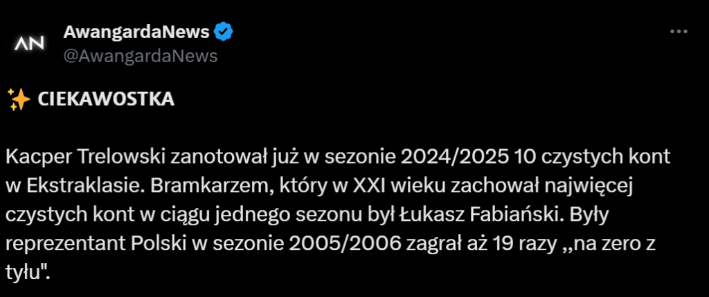 - Kacper Trelowski zachował dotychczas 10 czystych kont (dodatkowo na zero z tyłu od ponad 500 minut);