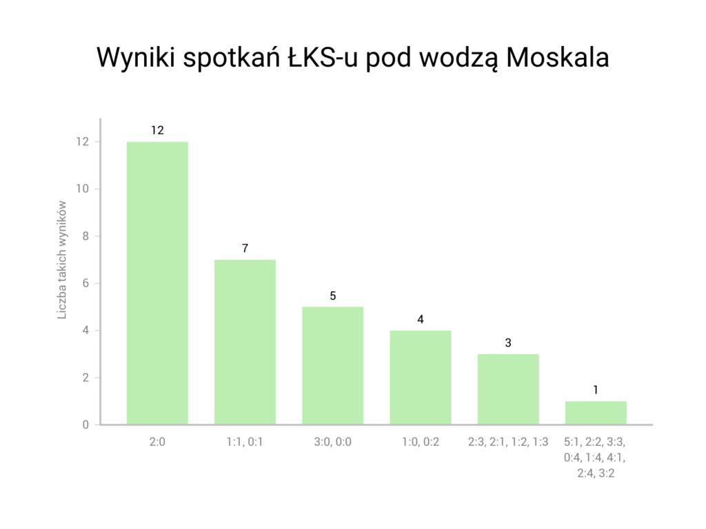 Na przestrzeni 64 meczów, prowadząc Łódzki Klub Sportowy, Kazimierz Moskal upodobał sobie przede wszystkim zwycięski wynik 2:0. Takim rezultatem łodzianie kończyli mecz za jego kadencji aż 12 razy. Pozostałymi „ulubionymi” wynikami byłego trenera „Rycerzy Wiosny” były 1:1 oraz 0:1 (po siedem razy), a także 3:0 i 0:0 (po pięć razy). Najwyższe zwycięstwo ŁKS-u pod wodzą Kazimierza Moskala zostało odniesione w meczu z Odrą Opole w Łodzi w listopadzie 2018 roku, wówczas ełkaesiacy pokonali rywali aż 5:1. Najbardziej bolesna porażka przypadła zaś na ekstraklasowy bój w Krakowie z Wisłą zakończony porażką gości 0:4.