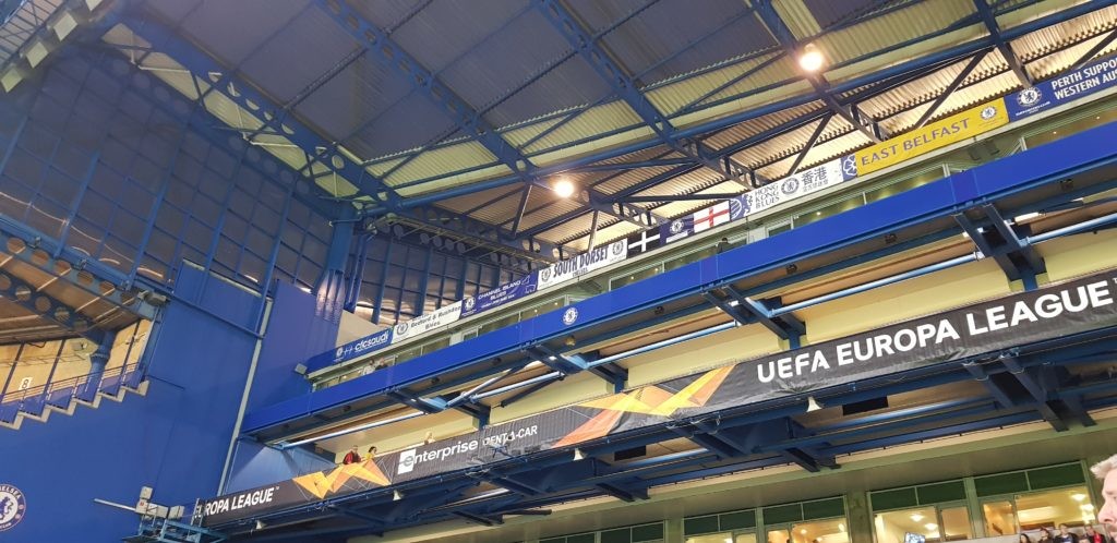 Po wejściu przez klimatyczne, szczelnie pozamykane poza dniem meczowym kołowroty i minięciu stref gastronomicznych oczom ukazało się wnętrze świątyni „The Blues”. Dzięki prawdziwie wyspiarskiej zabudowie stadionu od razu dało się poczuć atmosferę meczu. Jako osoba, która często lubi obserwować kibiców, ich zachowania i wyjątkowy dla każdego klubu styl, od razu moją uwagę przykuła kwestia flag kibicowskich. Poza sztandarowymi płótnami wiszącymi na trybunach za bramkami obie trybuny „proste” były w pełni odziane w banery fanów Chelsea z całego świata. Od Perth, przez Hong Kong aż do Perth, a także skromna flaga fanów z Polski. Widać, że w Londynie mają całkiem inne podejście do tak ważnych produktów z herbem klubowym dla kibiców, jakimi są flagi, niż ma to miejsce w Polsce. Wyobraźmy sobie jedną z głównych trybun np. Lecha, gdzie byłaby flaga każdej miejscowości Wielkopolski…