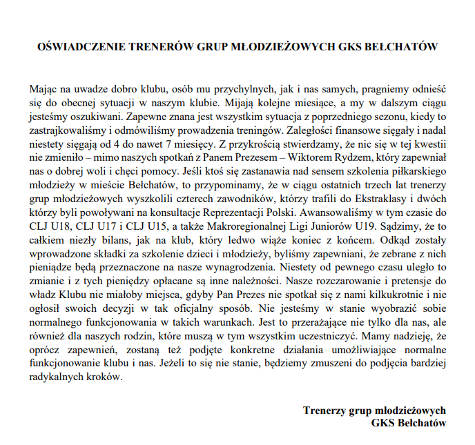 Nie byłem specjalnie zaskoczony tym oświadczeniem, bo przecież doskonale znam sytuację. Dotyczy ona w różnym zakresie zarówno trenerów grup młodzieżowych, jak i administracji czy pierwszej drużyny. Gdyby tylko była możliwość spłacania należności, klub przecież by to czynił. Obecnie nie ma na to środków. Nie jest to najprawdopodobniej głos wszystkich trenerów, tym bardziej że wczoraj doszło po podpisania umowy pomiędzy PGE i Akademią, która będzie gwarantem płynności wynagrodzeń. Tymczasem GKS „Bełchatów” S.A. będzie musiał czynić starania, by te narosłe niestety zobowiązania regulować.