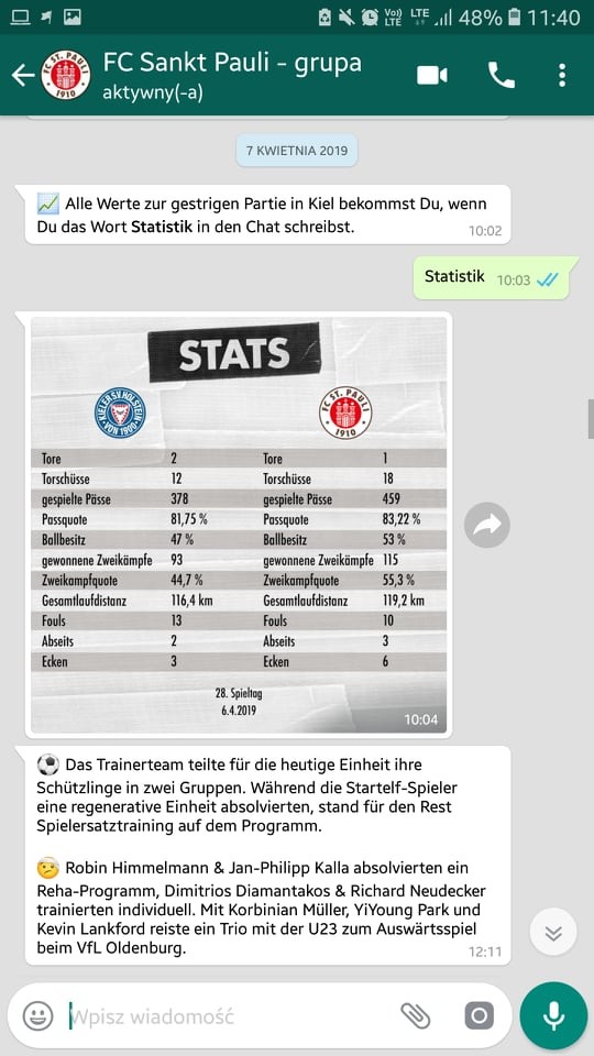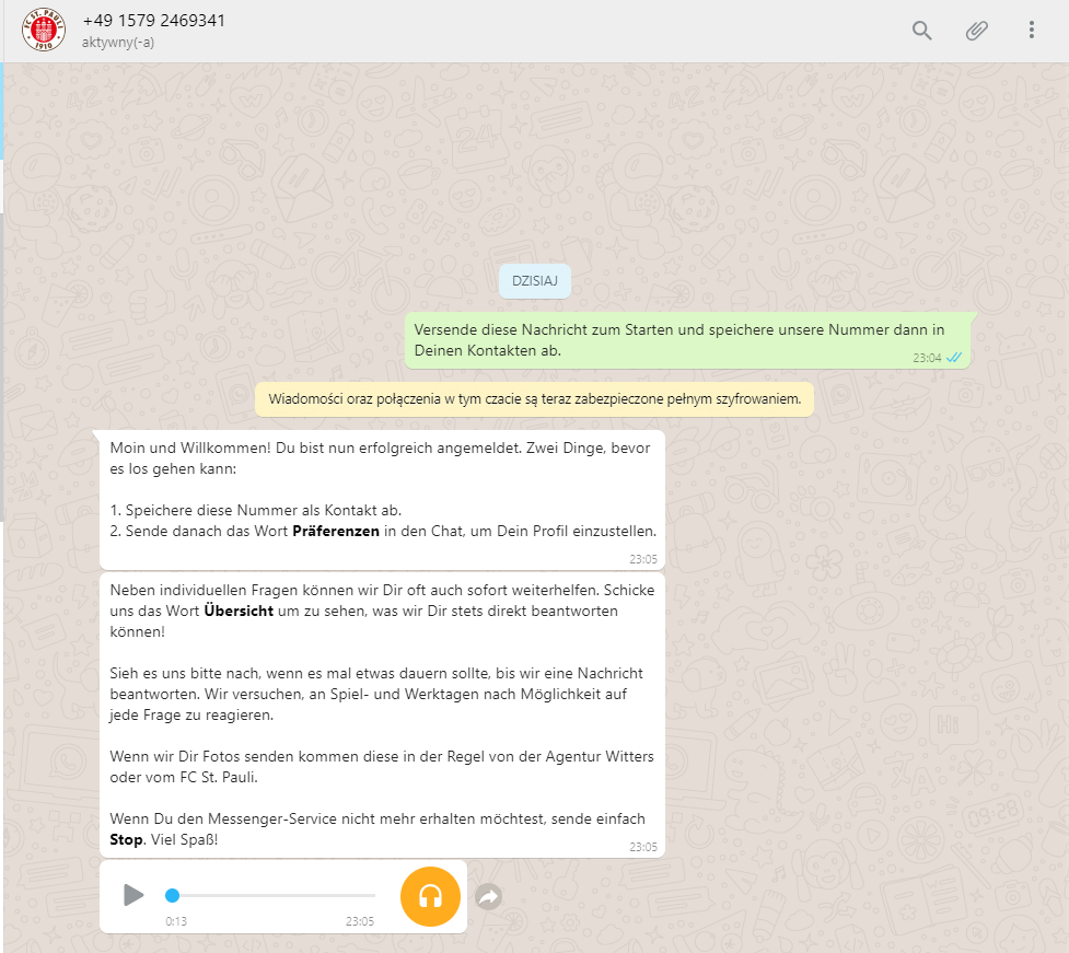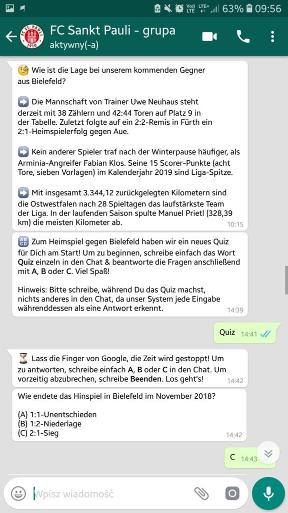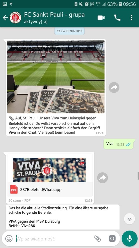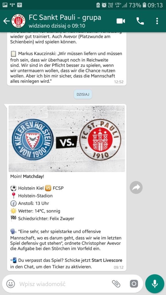 Ponieważ sama używam WhatsApp prowadzonego przez Sankt Pauli, najłatwiej będzie mi także porównać pomysły na prowadzenie komunikacji przez aplikację do klubów z Niemiec. Poza „Piratami” z aplikacji korzysta m.in. VfL Wolfsburg, Schalke 04, TSG Hoffenheim i VfB Stuttgart.