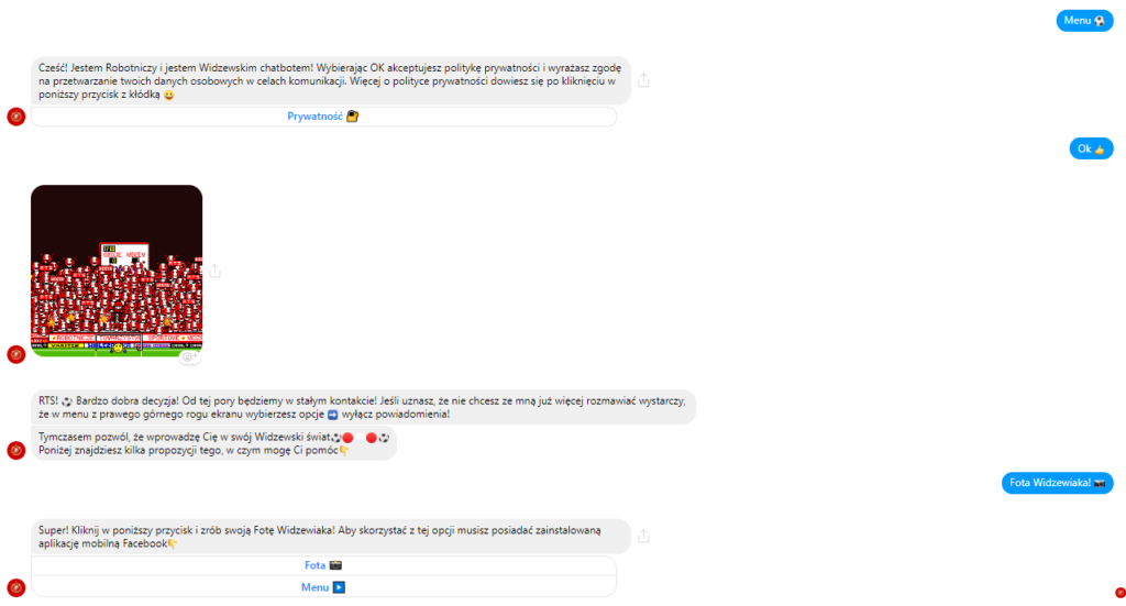 Śladami „GieKSy” wyruszył także Widzew Łódź i zaprezentował swojego bota – „Robotniczego”, stworzonego przy współpracy z firmą Chatbots. Czujemy w tym narzędziu duży potencjał i będziemy je rozwijać, tak by w przyszłości „Robotniczy” potrafił rozmawiać z naszymi kibicami na jak największą liczbę tematów – powiedział Tomasz Sadłecki, dyrektor technologii i innowacji w Widzewie [źródło: widzew.com]. Widzewski chatbot „Robotniczy” będzie dostarczał kibicom informacje o pojawiających się nowych artykułach, galeriach czy materiałach wideo oraz wysyłał wiadomości o najważniejszych wydarzeniach z życia klubu. Za jego pośrednictwem można sprawdzić swoją wiedzę na temat klubu w quizie oraz zrobić zdjęcie w barwach klubowych dzięki technologii AR.