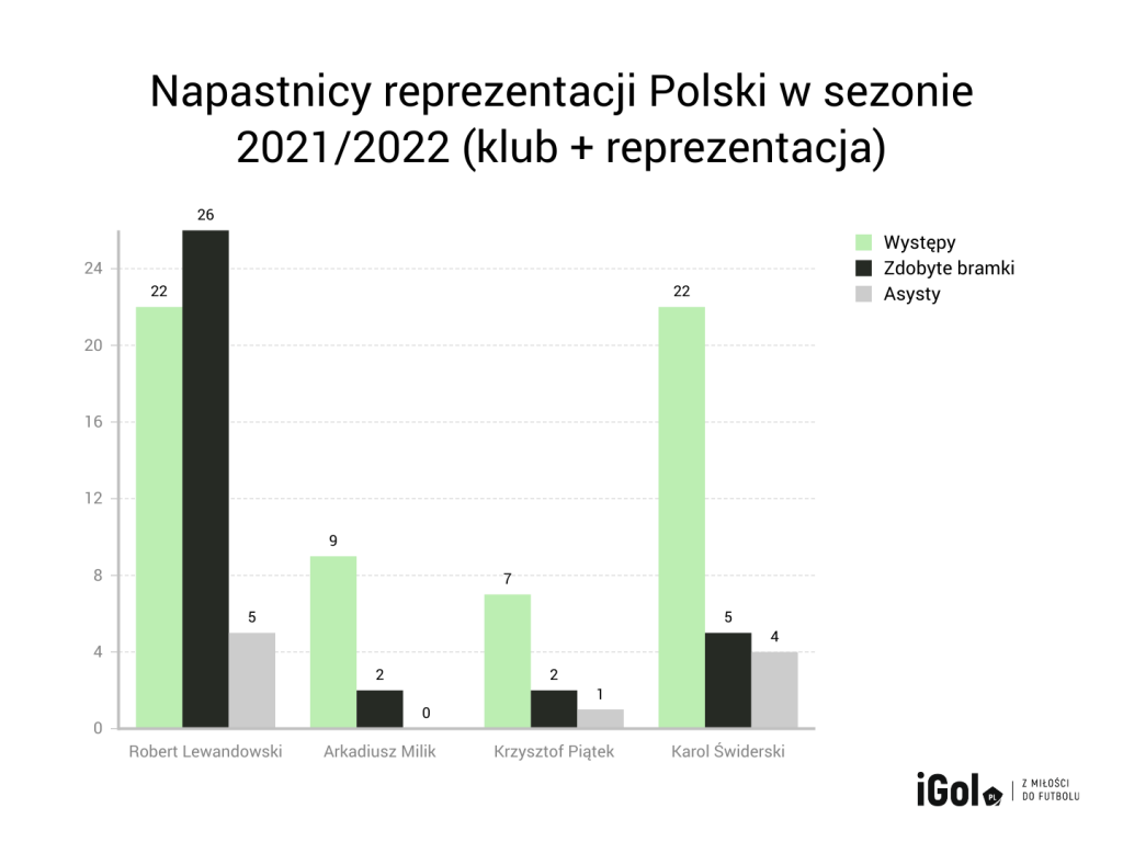 Występujący na co dzień w barwach PAOK-u Saloniki Karol Świderski jest zupełnie innym typem zawodnika niż wymieniona wyżej dwójka. Z Robertem Lewandowskim dzielił linię ataku reprezentacji Polski osiem razy. Dobrze wyglądała ich współpraca podczas Euro 2021 w meczach z Hiszpanią oraz Słowacją.