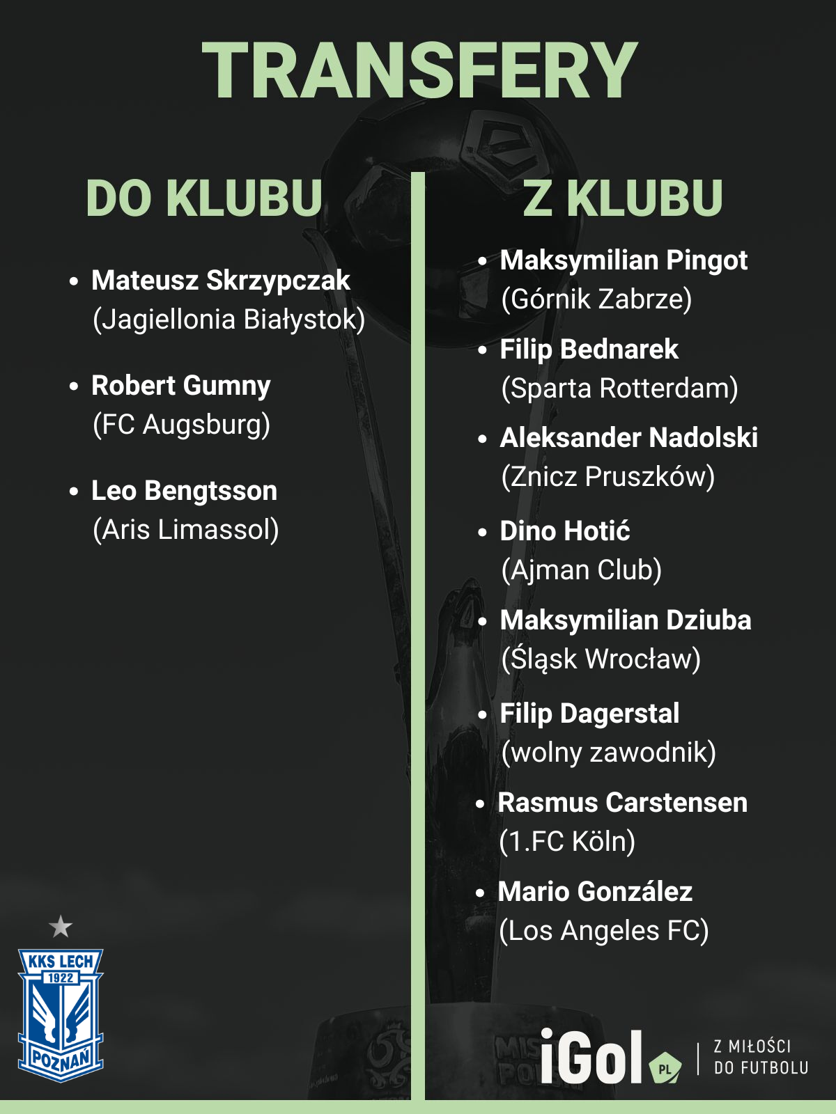 Jak na razie Lech Poznań nie odnotował poważnych strat kadrowych. Rozpoczął się jednak proces sporego wietrzenia szatni. Ma to pomóc znaleźć miejsce dla nowych, bardziej jakościowych nabytków. Z klubem definitywnie pożegnali się Maksymilian Pingot, Filip Bednarek, Aleksander Nadolski i Mateusz Medrala. Swoje wypożyczenia zakończyli także Mario Gonzalez i Rasmus Carstensen. Klub nie podjął działań, aby wykupić ich z zespołów macierzystych. W składzie Lecha zabraknie Dino Hoticia, który uległ ofercie ze Zjednoczonych Emiratów Arabskich i zasilił szeregi Ajman Club. Na ławce nie zobaczymy też Filipa Dagerstala czy Maksymiliana Dziuby, który udał się na wypożyczenie do Śląska Wrocław.