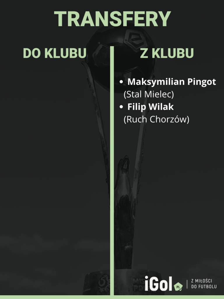 Z klubu na wypożyczenia odeszli młodzi Filip Wilak do Ruchu Chorzów i Maksymilian Pingot do Stali Mielec. Ekstraklasowy Radomiak na pierwszoligową Polonię Warszawa zamienił bramkarz Krzysztof Bąkowski, ale to tylko zmiana kierunku wypożyczenia.