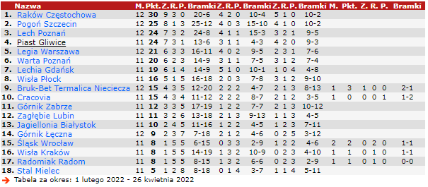 Jak jest teraz? Piast zajmuje już piąte miejsce i swoją zdobycz punktową podwoił. Sęk w tym, że potrzebował do tego nie dziewiętnaście, ale jedenaście kolejek. Kolosalna różnica, która oczywiście nie może dziwić. To też powoduje, że drużyna Fornalika jest ligową czołówką, jeśli spojrzymy tylko na ten rok kalendarzowy.