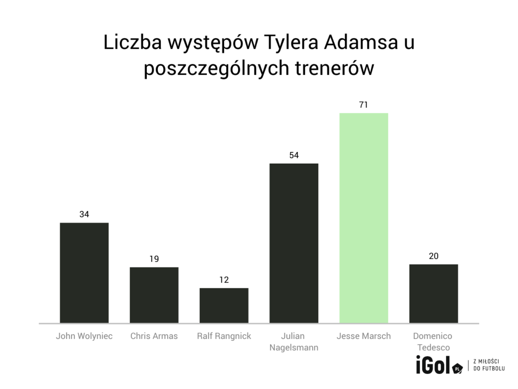 Aby była jasność – Tyler Adams nie jest wyrzutkiem RB Lipsk. Niektórzy pewnie mieli co do niego większe nadzieje, natomiast mimo wszystko jego przygody w Niemczech nie powinno się określać jako nieudane doświadczenie. Czasem grał więcej, a czasem mniej, natomiast gdy był na boisku, raczej często dawał spokój z tyłu. W defensywie radzi sobie dobrze, ale warto też podkreślić, że może być wysunięty lekko do przodu i tam też daje radę. Piłkarz wszechstronny, gwarantujący po prostu dużą dynamikę, co w optyce Marscha jest kluczową kwestią.
