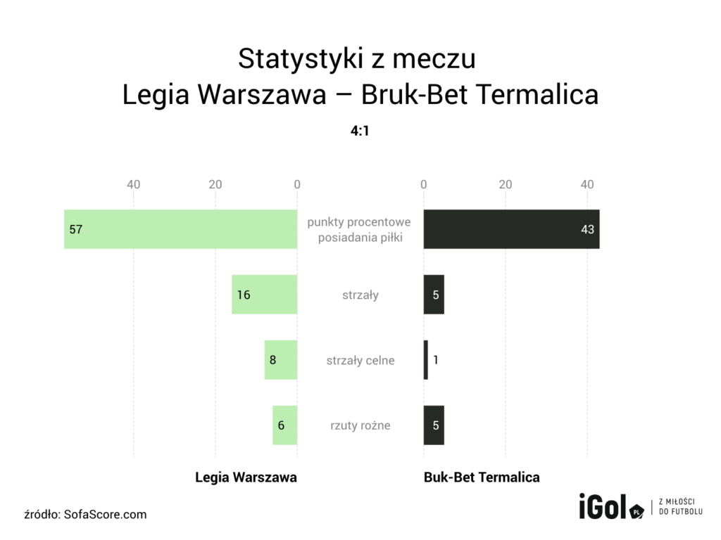 Niemniej druga połowa spotkania była gorsza jakościowo niż pierwsza, lecz nie ma w tym nic dziwnego. Legia prowadziła po pierwszych 45 minutach 3:0, co było satysfakcjonującym wynikiem. Warszawianie mieli przez prawie całe spotkanie wszystko pod kontrolą. Dlaczego prawie? Ponieważ w końcówce rywalizacji stracili bramkę z rzutu wolnego, choć nie pozostawiło to wielkiej rysy na końcowej ocenie. Zawodnicy z Łazienkowskiej byli bowiem znacznie lepsi od swojego przeciwnika. Wynik i statystyki to w stu procentach odwzorowują.