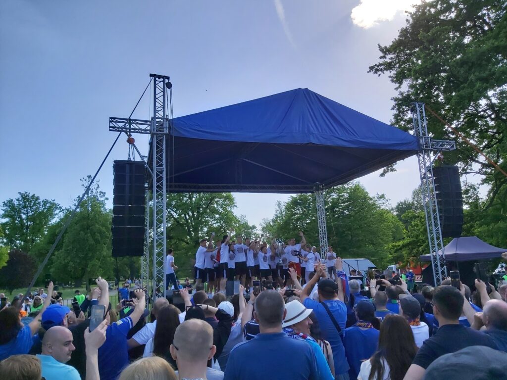 Godzinę później piłkarze oraz trenerzy spotkali się z fanami w parku miejskim, zaledwie kilkaset metrów od stadionu. Niestety tym razem nie była możliwa powtórka fety z 2018 roku, kiedy to zawodnicy znajdowali się na górnej części autobusu bez dachu. Kibice mogli się poczuć niczym na festynie. Do ich dyspozycji były między innymi kiełbaski oraz piwo. Przy scenie z kolei na telebimie wyświetlano kulisy kręcone przez media klubowe na przestrzeni całego sezonu. Można było również zobaczyć skrót finału Pucharu Polski z 1992 roku oraz wszystkie strzelone w tym sezonie bramki.