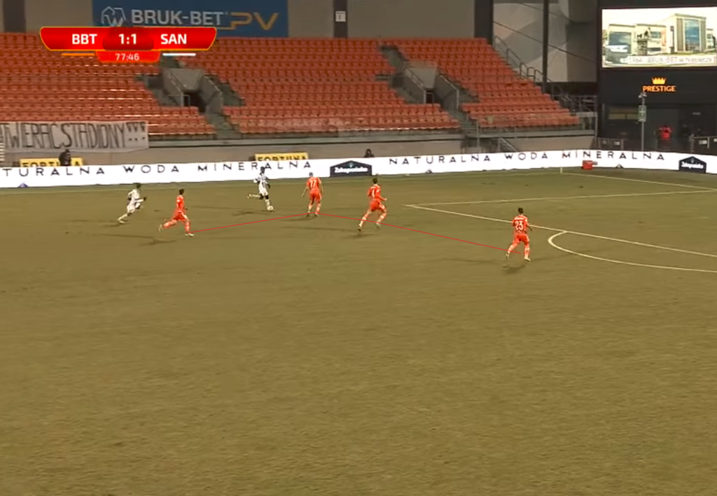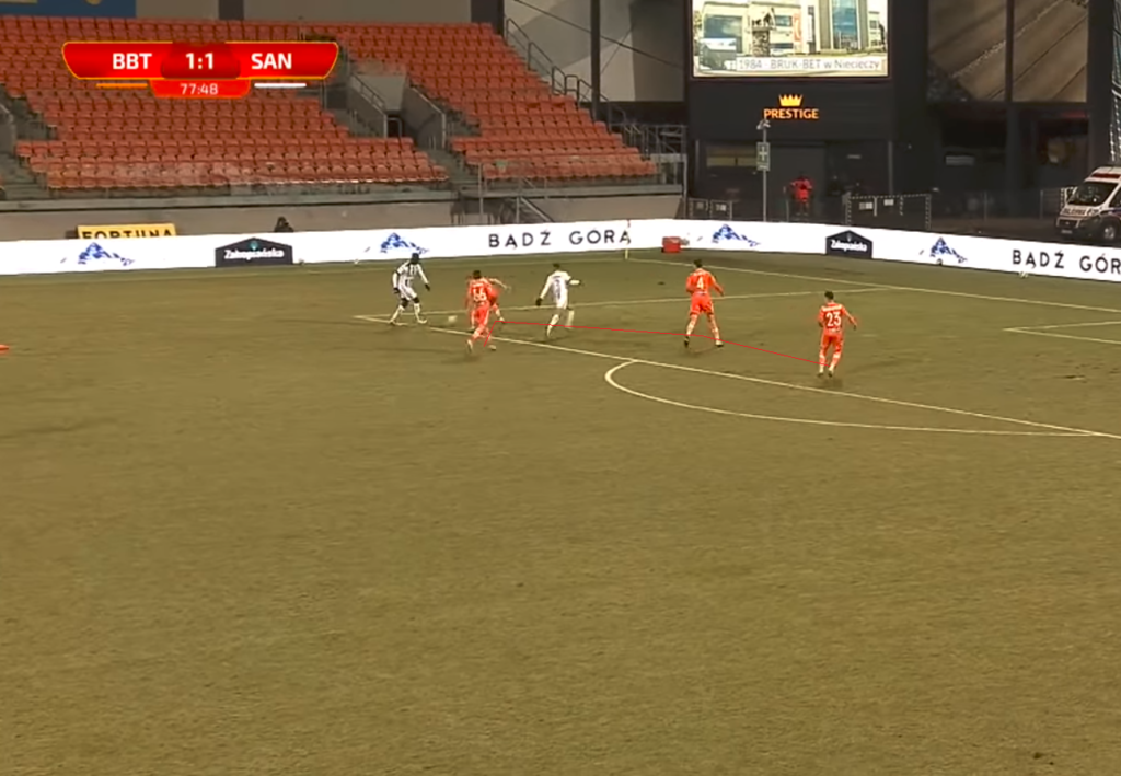 Co tu dużo mówić, sytuacja 2 na 4 z korzyścią dla Termaliki. Mało tego, na horyzoncie nie widać wsparcia ze strony innych zawodników Sandecji (Termaliki też). Trzech obrońców ustawionych w linii, czwarty bardzo blisko rywala bez piłki. Właściwie niewiele może się w tej sytuacji stać, prawda?