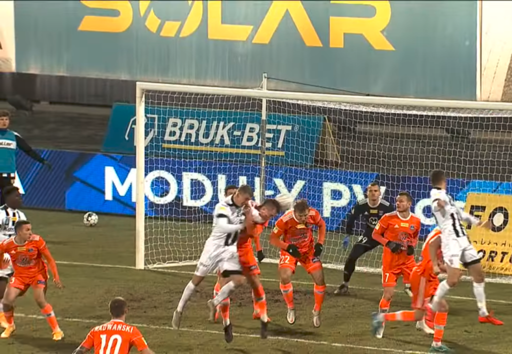 Wydaje się, że mecz z Zagłębiem powinien skutecznie oduczyć zawodników z Niecieczy lekceważenia rywali oraz nonszalancji. Jak się jednak okazuje, bramki stracone z Sandecją również wynikały z błędów w kryciu oraz braku podejścia i zaangażowania przez piłkarzy Bruk-Betu. Zacznijmy analizę od pierwszej bramki dla nowosądeczan. Trudno mówić tutaj o sporych błędach, bo Kacper Śpiewak oraz Adrian Danek razem wyskoczyli do piłki zagranej z rzutu rożnego. Całość wygląda tak, jakby razem uderzyli ją oni do bramki Termaliki. Jeśli chodzi o krycie, przyczepić się można jedynie do tego, że Śpiewak trzymał pieczę nad rywalem od nieco niewłaściwej strony.