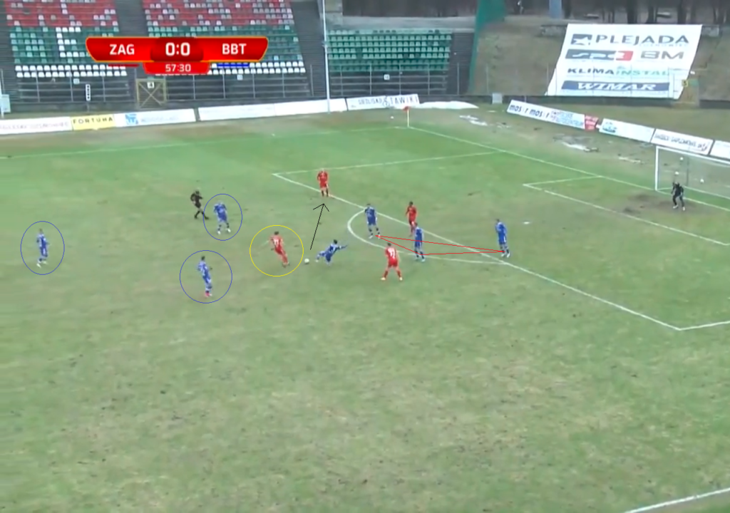 Akcja pod bramką Zagłębia przekształciła się w kontrę gospodarzy. Dwa podania wystarczyły sosnowiczanom, aby znaleźć się w przedstawionej wyżej sytuacji, choć zaznaczony na żółto Szymon Sobczyk pokonał dystans od linii środkowej boiska do pokazanego miejsca. W tym momencie za piłką pozostaje sześciu graczy Termaliki. W żaden sposób nie pomagają swoim obrońcom, nie uczestniczą w całej akcji. Czterech zawodników broniących ma tylko teoretyczną przewagę. Ustawieni w „kwadrat” piłkarze Termaliki nie pozwalają napastnikowi wejść z piłką do środka, jednak Sobczyk skupił na sobie taką uwagę, że na bokach pojawiło się sporo miejsca, aby zagrać do partnerów. Warto zwrócić uwagę na zawodnika w czerwonej koszulce, który znajduje się w kole środkowym – on za moment odegra kluczową rolę w tej akcji.