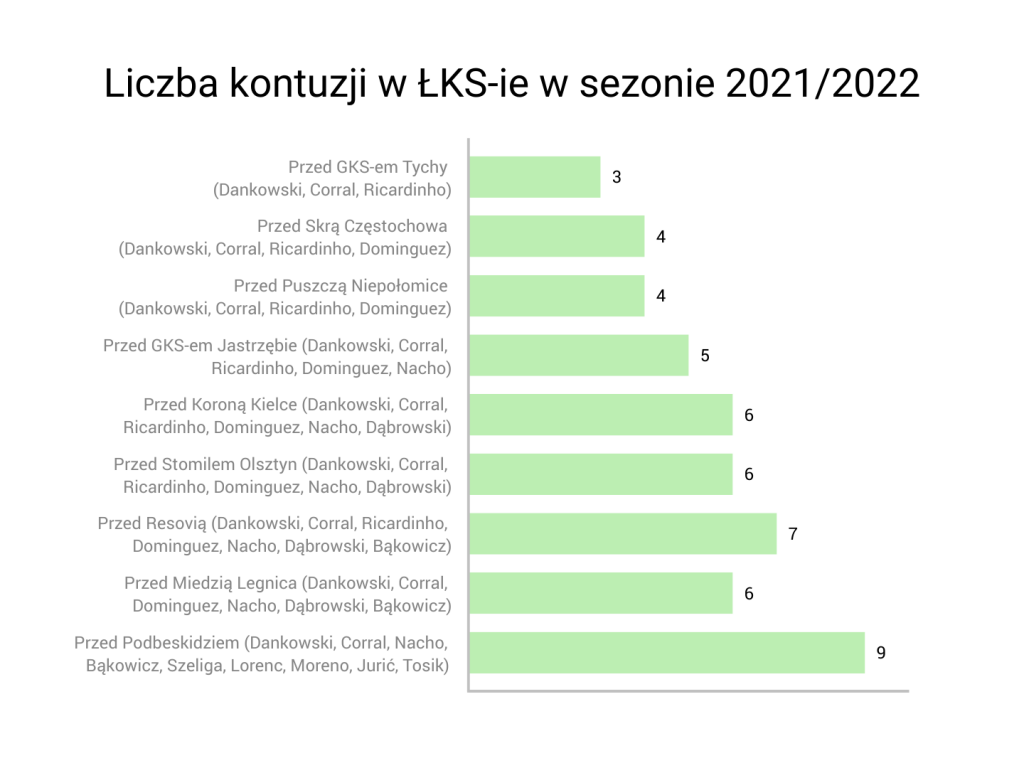 Sezon 2021/2022 ŁKS zaczynał, mając kontuzjowanych trzech zawodników i z wracającymego do zdrowia, ale będącym już w kadrze meczowej Nacho Monsalve. Dwie z trzech absencji – Corral i Dankowski – to jeszcze pozostałości po zeszłej kampanii, Ricardinho zaś kontuzji nabawił się przed sezonem. Tragedii wówczas nie było.