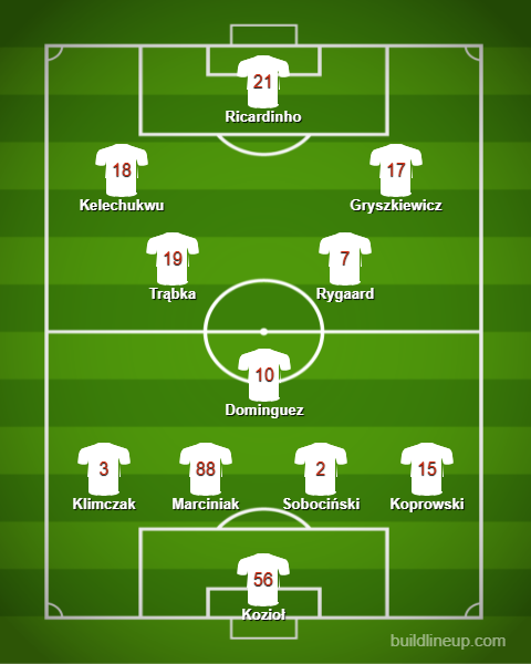 W konsekwencji ŁKS spotkanie kończył tak (grafika poniżej). Z kadry uznawanej przez wielu za najsilniejszą w 1. lidze pozostały resztki. Oskar Koprowski na prawej stronie defensywy (a jego naturalne środowisko to lewy bok lub pozycja numer „sześć”), a z przodu tercet Kelechukwu – Gryszkiewicz – Ricardinho. Przez sezonem nie do pomyślenia, ale to możliwości w tym przypadku determinowały wybór.