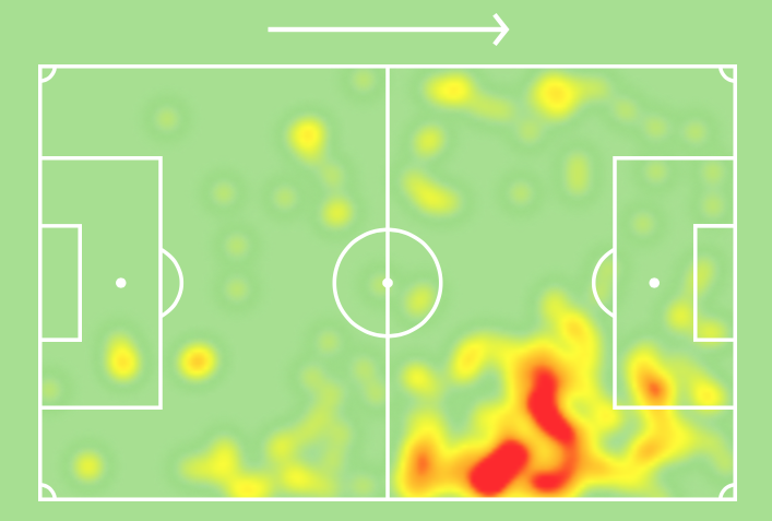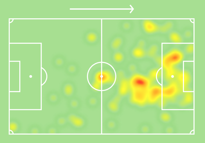 Teoretycznie oczywisty wybór na pozycję numer dziewięć w tym sezonie rozegrał pięć spotkań, podczas których grał średnio 64 minuty. Ten spędzony czas na boisku pozwolił mu na zdobycie jednej bramki oraz trzech asyst. Dodatkowo warto podkreślić, że zalicza on w grze 1,6 kluczowego podania. Jednak najlepszym pokazaniem ulubionej tercji gry reprezentanta Brazylii będzie poniższa heatmapa z tegorocznych rozgrywek ligowych.