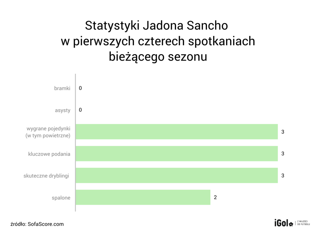 Jednak co mogło zmartwić kibica? Dyspozycja Jadona Sancho. Młody Anglik grał zdecydowanie poniżej oczekiwań. W jego występie nic nie było przekonujące, poczynając od samych zagrań, kończąc na statystykach. Nic dziwnego, że skrzydłowy nie zdołał zebrać pozytywnych ocen, a jego liczby wyglądają dość mizernie.