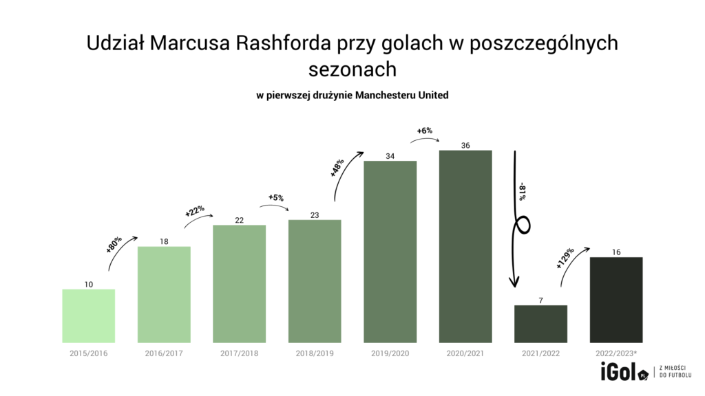 Rashford dostał kolejną szansę na zaistnienie, a Erik ten Hag od początku swojej kadencji widział w nim tego młodego, ambitnego chłopaka sprzed siedmiu lat. Zawodnika głodnego gry, głodnego goli, a przede wszystkim znaczne ulepszenie dla drużyny, która po odejściu Cristiano Ronaldo długo nie musiała czekać na nowego goleadora. A nawet nie była zmuszona w tym celu nikogo ściągać. Jak się okazało, został nim Marcus Rashford, który tę daną mu przez trenera szansę wykorzystuje perfekcyjnie.