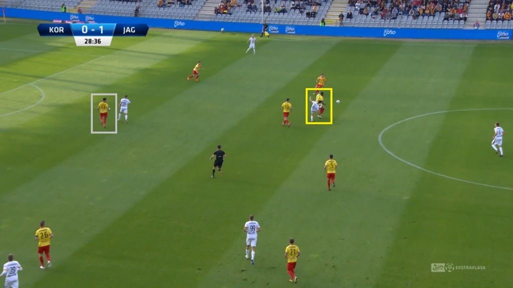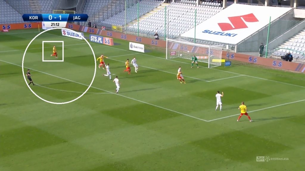 Tak jak Ivan Marquez wzmocnił linię defensywną, tak Matej Pučko bryluje w formacji ataku. Od czasu Luisa Carlosa Korona nie dysponowała graczem mijającego przeciwników dryblingiem z taką swobodą. Choć dynamiczny Słoweniec bazuje głównie na motoryce, to większość pojedynków jeden na jeden kończy powodzeniem. Jednak tym, co zdecydowanie wyróżnia ofensywnego gracza, (i to na tle całej ligi) są kwestie taktyczne. Matej Pučko przez cały czas spędzony na murawie jest w ruchu. Gra bez piłki w sposób nowoczesny, w zachodnich ligach nie będący już czarną magią. Ustawia się bardzo szeroko, tuż przy linii bocznej boiska, szukając wolnej przestrzeni (biały okrąg). Bez względu na to czy operuje po prawej, czy po lewej stronie. Dzięki temu gubi krycie i tworzy zagrożenie pod bramką przeciwnika. Często schodząc do środka boiska.