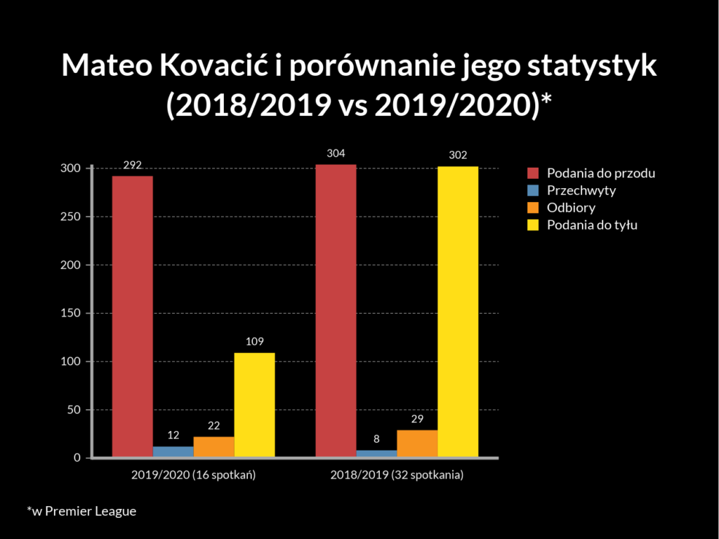 Żelazną pracowitością, genialną wizją gry czy piłkarskim czary-mary, którego akurat w ostatnim czasie czarodziej z Chorwacji serwuje w uzależniających dawkach. Co w tym niesamowite, nie minęła nawet połowa sezonu, a Mateo Kovacić już w tej chwili dysponuje liczbami z poprzedniej kampanii. A tą być może najbardziej interesującą jest liczba podań do tyłu, których Chorwat notuje wyraźnie mniej. Wniosek brzmi zatem prosto: Frank Lampard wykreował kogoś, kto na dzisiaj oferuje światowy poziom niemal w każdym aspekcie sztuki środkowego pomocnika.