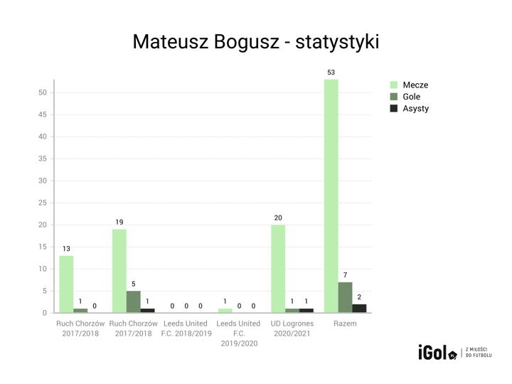 Mateusz Bogusz swoją karierę zaczynał w młodzieżowych drużynach Ruchu Chorzów, skąd przebił się do seniorskiego zespołu. Szansę na debiut dostał już w wieku 17 lat i jego kariera zaczęła nabierać rozpędu. Swoją grą zapracował sobie na transfery do zdecydowanie lepszych lig niż polska. Aktualnie gra w UD Logrones, gdzie na początku był chwalony za swoje występy, teraz jednak jego kariera znów zwalnia. Miejmy nadzieję, że to tylko chwilowy spadek formy.