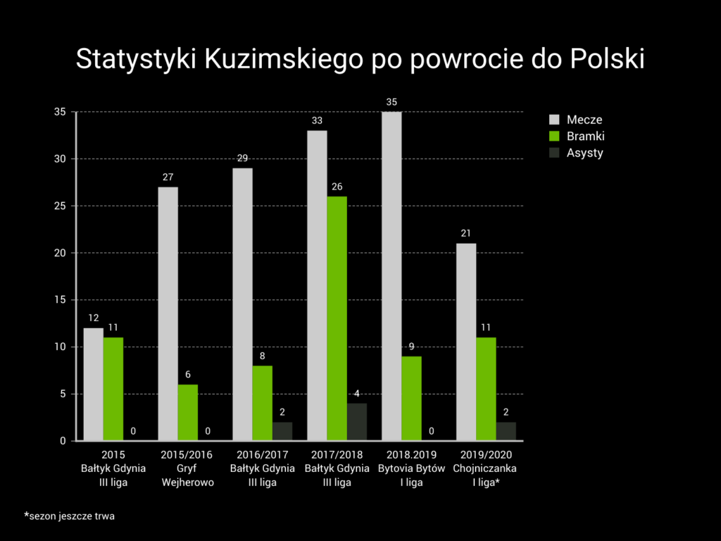 Chojniczanka Chojnice ma w tym sezonie duże kłopoty. Klub prowadzony początkowo przez Josefa Petrika, a potem Zbigniewa Smółkę jest obecnie w strefie spadkowej i walczy o utrzymanie w 1. lidze. Jednak mimo to w składzie wyróżnia się jedna osoba – Mateusz Kuzimski. 28-latek strzelił dotychczas 11 goli, a także imponuje walecznością na boisku. Równie ciekawa jak obecne dokonania wydaje się droga, jaką przeszedł ofensywny zawodnik w czasie swojej kariery.
