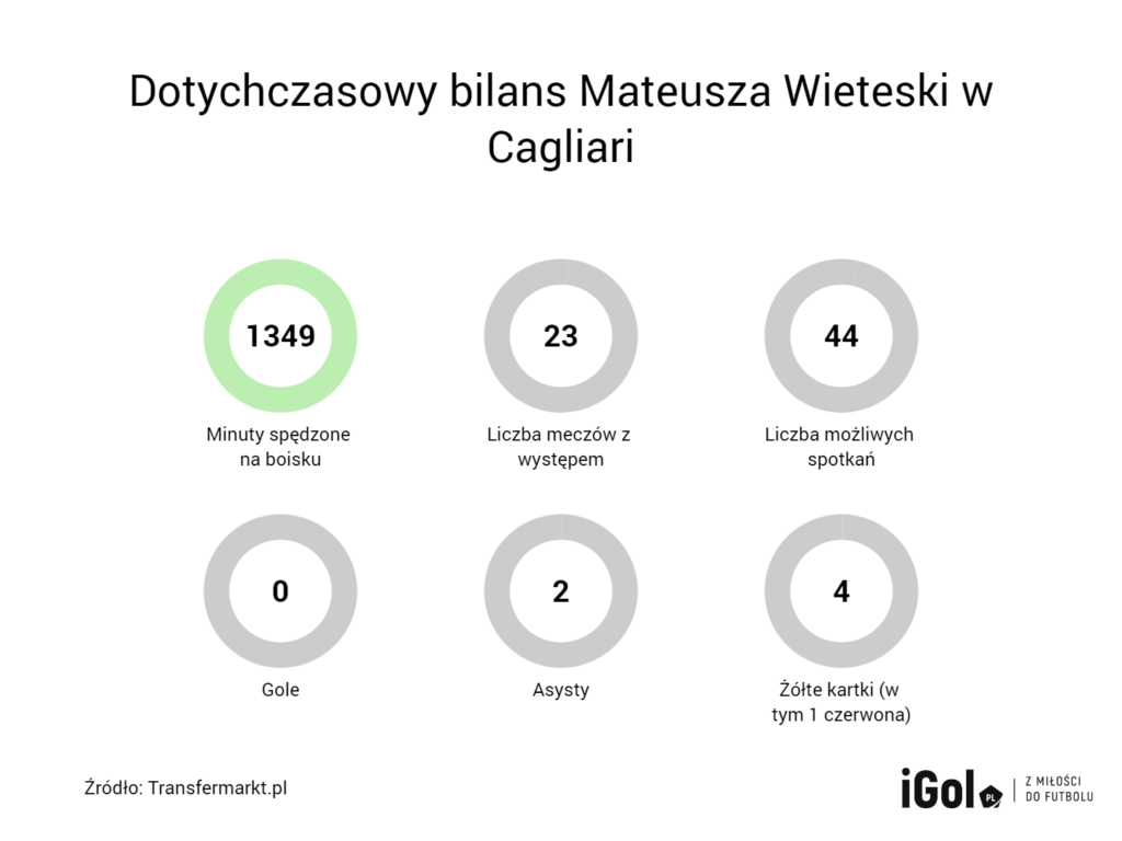 Mateusz Wieteska w zeszłym sezonie zamienił położone w centralnej części Francji Clermont-Ferrand na wyspiarskie Cagliari we Włoszech. Jednak słoneczna Sardynia na razie okazuje się dla niego pochmurna. O ile jeszcze początek przygody był obiecujący (doceniliśmy go choćby w naszym rankingu najlepszych obrońców 2023 roku), tak z czasem Polak długo nie podnosił się z ławki. W ubiegłych rozgrywkach nie zagrał ani minuty od końca października do początku stycznia, z wyjątkiem meczów w Pucharze Włoch. A im dalej w sezon, tym minut nie przybywało.