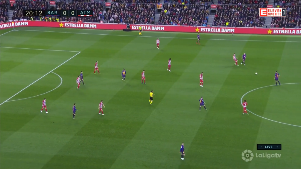 Gdyby nie czerwona kartka dla Diego Costy w 28. minucie, która argentyńskiemu trenerowi pokrzyżowała szyki, prawdopodobnie tak. Na powyższym zdjęciu można zauważyć, że w początkowej fazie meczu przestrzenie zajmowane przez „Los Colchoneros” były dobrze obstawione. Gdy piłka zagrywana przez piłkarza Barcelony (najczęściej Busquets i Arthur) mijała napastników Atletico, madrycki zespół zamykał pole do gry zawodnikowi, który ją otrzymał. Inaczej mówiąc, „Barca” była skutecznie wypychana ze stref zagrożenia.