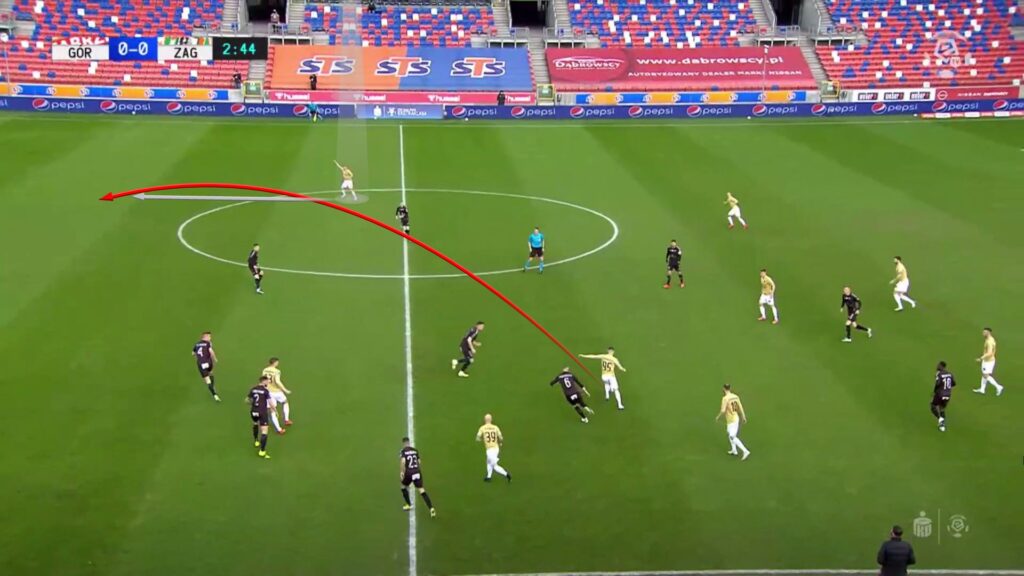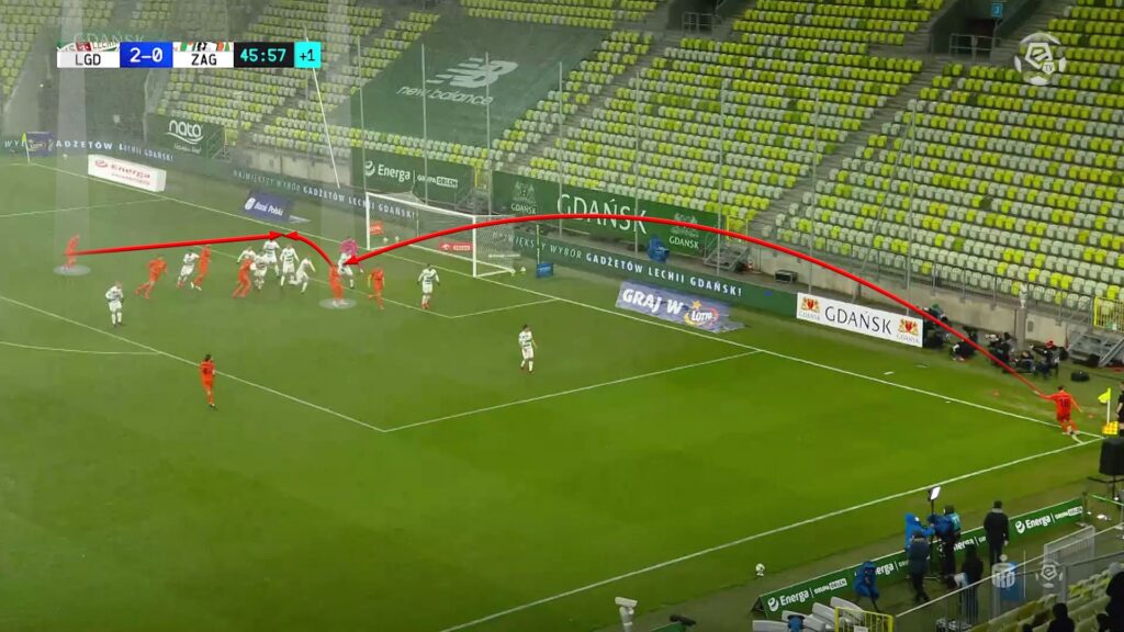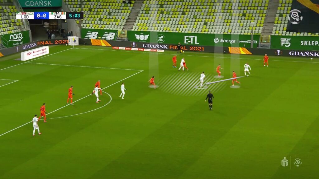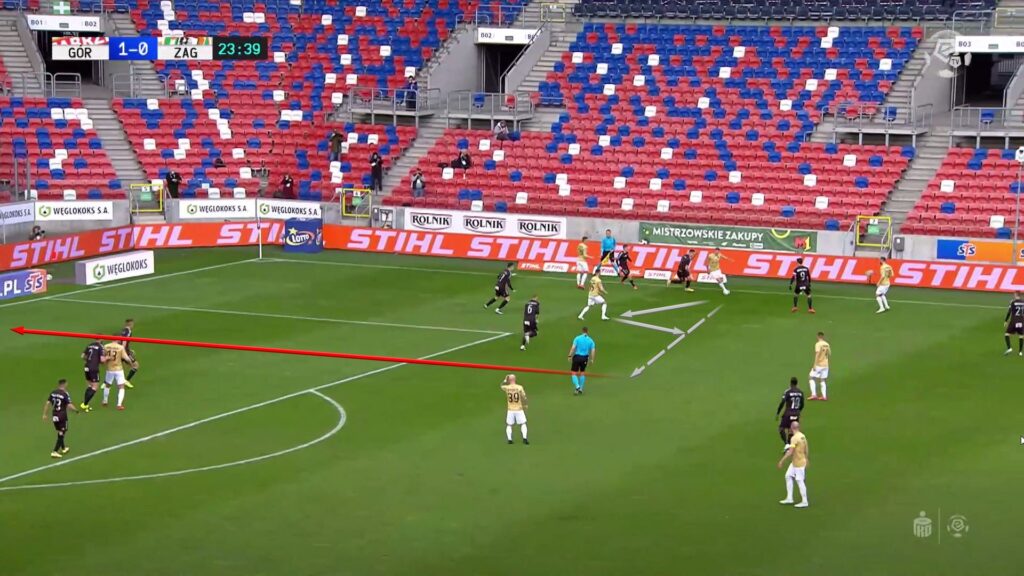 Jak widać na powyższym obrazku, Zagłębie często stosuje długie podanie. Wykorzystuje to, że rywale podchodzą wysoko, a linia obrony rywali ustawiona jest praktycznie na połowie boiska. Ogólnie rzecz biorąc, podopieczni trenera Seveli lubią i często grają długie, wysokie piłki. Szybko przenoszą ciężar gry w inną stronę boiska. W rozegraniu raczej stosują proste środki i nie bawią się w rozgrywanie piłki po ziemi. W tej sytuacji Drazić kapitalnym podaniem uruchamia Szysza, który wychodzi na sytuację sam na sam z bramkarzem.