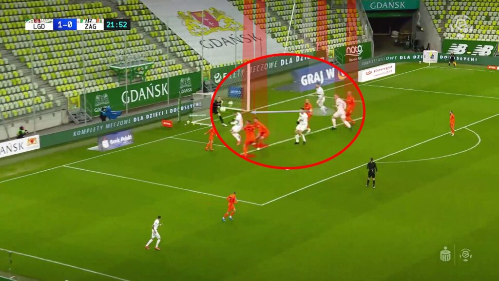 Jak widzimy na wyżej załączonym obrazku, piłkarze Zagłębia Lubin zostawili kompletnie bez opieki Łukasza Zwolińskiego. Brakiem doskoku do rywala, zostawieniem dużej ilości miejsca w niebezpiecznej strefie Zagłębie samo wpędziło się w trudną sytuację, gdyż już od 6. minuty musiało odrabiać straty. Szczególnie w tej sytuacji nie popisali się Baszkirow oraz Filip Starzyński. Ten ostatni jeszcze próbował odebrać piłkę, ale nie był w stanie tego zrobić z silniejszym Zwolińskim. Niestety nie jest to jedyna taka sytuacja w tym, jak i innych spotkaniach, że piłkarze w pomarańczowych strojach zostawiają dużo miejsca rywalom.