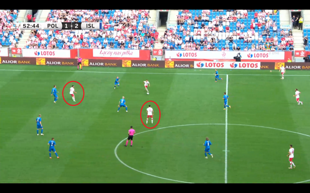 Analogicznych sytuacji jak ta była masa. Mała liczba polskich piłkarzy w rozegraniu, cofający się Lewandowski, Świerczok ustawiony w pozycji niepozwalającej na posłanie prostopadłego zagrania. Choć nie wszystko można usprawiedliwić nieporadnością drugiej linii. Zarówno Świerczok, jak i Lewandowski z Islandią nie rozegrali swoich dobrych meczów.