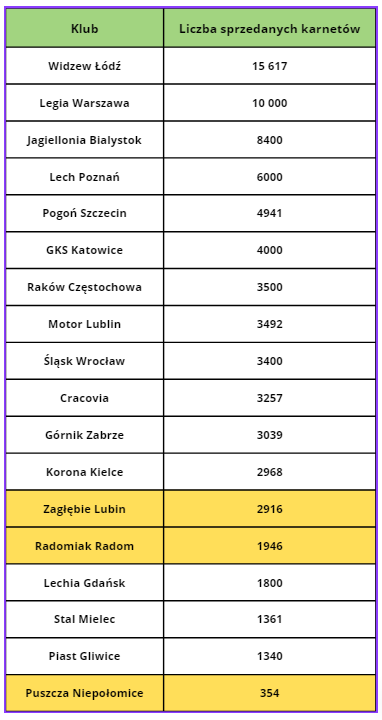 Tam, gdzie poprzedni sezon był kiepski lub rozczarowujący, sprzedanych abonamentów jest mniej. Spadek zaliczyli Lech, Pogoń, Radomiak i Widzew. U Lecha różnica jest naprawdę duża, wynika to ze słabego poprzedniego sezonu oraz faktu, że w poprzednim lecie w Poznaniu został pobity rekord sprzedaży karnetów.