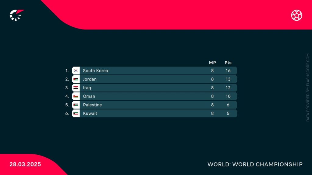 I nie bez powodu wspominamy właśnie o Omanie, gdyż ma on realną szansę, by zaatakować pozycję premiowaną bezpośrednim awansem. Przede wszystkim w następnej kolejce Oman zagra na własnym stadionie bezpośredni mecz z Jordanią, który będzie absolutnie kluczowy. Czemu? Ponieważ w ostatniej serii gier dwaj bezpośredni rywale – Jordania i Irak – zagrają przeciwko sobie, więc ktoś z nich na pewno straci punkty. Oman natomiast podejmie Palestynę, znajdującą się w dolnej części tabeli. Oznacza to, że w przypadku zwycięstwa w pierwszym meczu czerwcowej przerwy reprezentacyjnej, to właśnie kraj z zachodniej części Półwyspu Arabskiego będzie na pole position w walce o bezpośredni awans.
