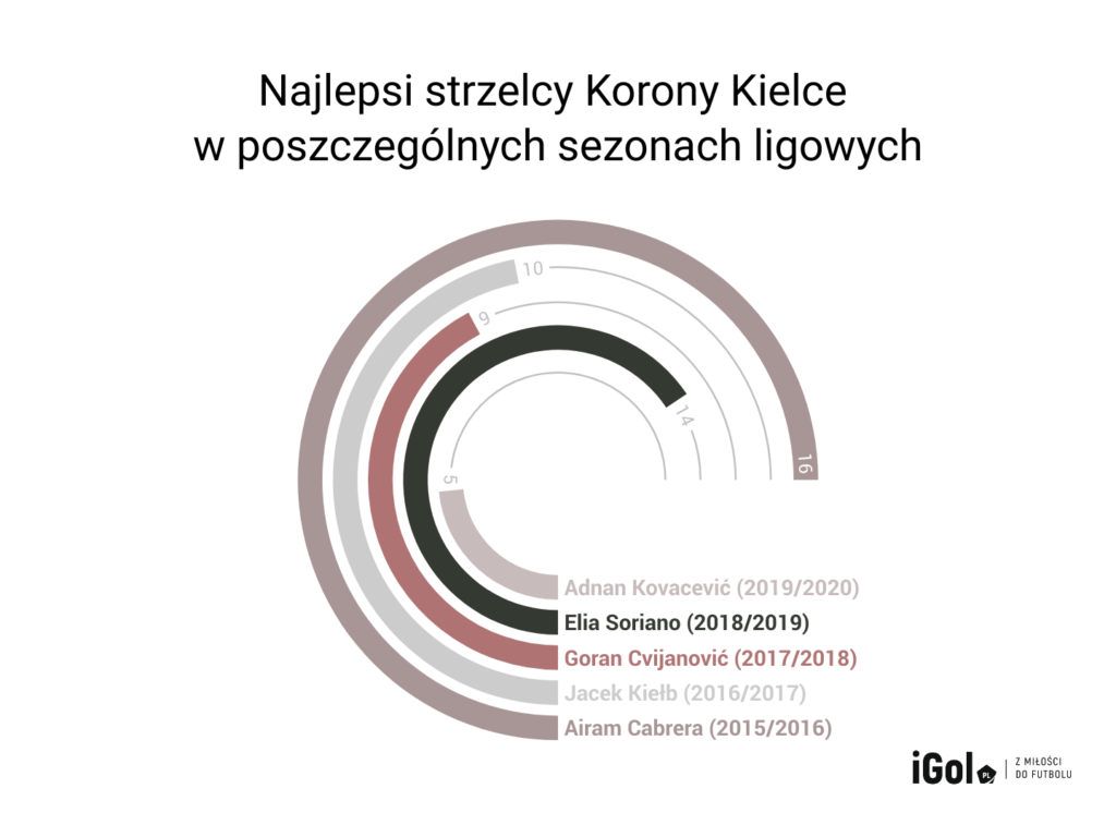 Po odejściu Niki Kaczarawy oraz Gorana Cvijanovicia nowym liderem ofensywny automatycznie został Elia Soriano. Włoski napastnik, który w trakcie poprzedniej kampanii zmagał się z różnymi kontuzjami, bardzo solidnie wywiązywał się ze swojej roli. Choć często nie wykorzystywał dogodnych sytuacji, to i tak w trakcie całego sezonu ligowego 2018/2019 czternastokrotnie pokonywał golkiperów rywali. Zespół z Suzuki Areny tym razem nie zdołał jednak zakwalifikować się do grupy mistrzowskiej. Po zakończeniu kampanii, co stało się tradycją, najskuteczniejszy strzelec Korony Kielce opuścił klub. Elia Soriano wyruszył na podbój holenderskiej Eredivisie, a na Suzuki Arenie ponownie rozpoczęli poszukiwania następcy podpory ofensywy.