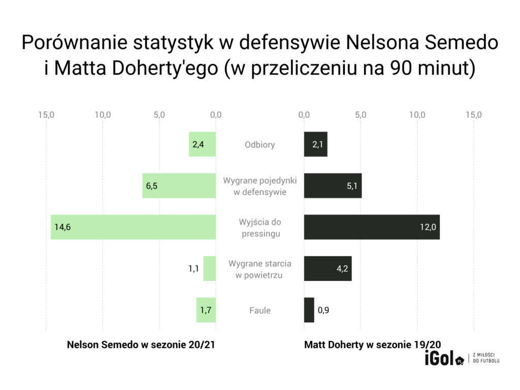 Jeśli chodzi o statystyki Nelsona Semedo w obronie, to w porównaniu z liczbami, jakie w zeszłym sezonie odnotowywał Matt Doherty, wygląda to obiecująco. Niewiele się one różnią, co można zaobserwować na poniższym wykresie.