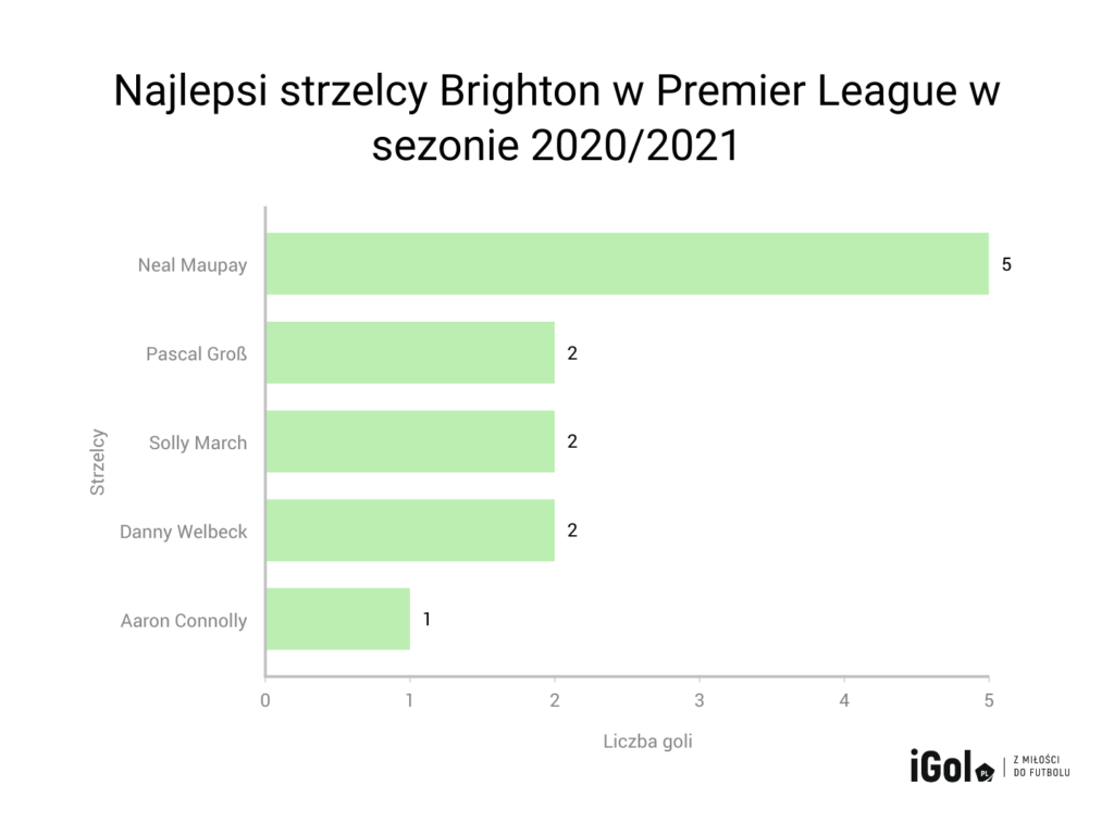 Poruszając problem wykańczania akcji, trzeba od razu rzucić okiem na napastników Brighton. Najlepszym strzelcem zespołu w Premier League jest Neal Maupay. Francuz ma na swoim koncie pięć bramek. To właśnie na nim „Mewy” muszą opierać swoją grę w ataku. Gole 24-latka stanowią ponad 25% wszystkich trafień zespołu Grahama Pottera w tym sezonie w Premier League, a potencjalnych zawodników, którzy mogliby go odciążyć, nie widać. Takim piłkarzem miał być Danny Welbeck, ale na razie jego forma strzelecka pozostawia wiele do życzenia.