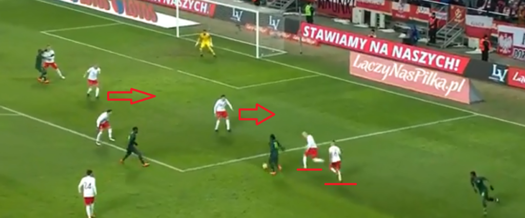 Trzyosobowy blok defensywny pozwala Polakom na zyskanie przewagi fizycznej i liczebnej w polu karnym. Trio Piszczek – Glik – Kamiński popełniło jednak sporo indywidualnych pomyłek. Obrońcy słabo radzili sobie w bezpośrednich starciach z nieszablonowymi atakującymi Nigerii i prokurowali groźne rzuty wolne.