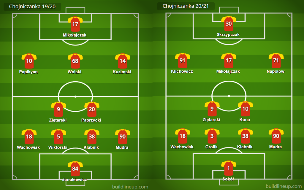 Jeszcze pod wodzą Zbigniewa Smółki drużyna Chojniczanki miała wyraźne problemy z grą w środku pola. Nawet nie pomógł eksperyment z przesunięciem Tomasza Mikołajczaka na pozycję ofensywnego pomocnika. Jednak teraz przyniosło to efekt. Również w środku pola pojawiły się niewielkie zmiany. Robert Ziętarski w pewnym sensie przejął rolę po Bartoszu Wolskim i odpowiada za krótkie rozegranie piłki. W dodatku często decyduje się na oddanie strzału z dystansu i w tym przeważa nad byłym zawodnikiem Bytovii Bytów. Z kolei Maciej Kona lepiej czuje się w dalekich zagraniach i więcej pracuje w defensywie od Ziętarskiego. Niżej po piłkę schodzi też Tomasz Mikołajczak, dzięki temu Chojniczanka Chojnice tworzy przewagę w środku pola i daje to kolejne możliwości rozegrania akcji.