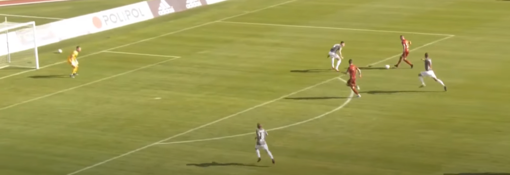 Od tej sytuacji rozpoczęła się akcja bramkowa na 2:0. Maciej Kona odebrał piłkę Omidowi Popalzay’owi, którą zgarnął Tomasz Mikołajczak. Kapitan Chojniczanki wziął udział w kontrze razem z Serhijem Napołowem i Szymonem Skrzypczakiem. Znajdujący się na lewej stronie Mateusz Klichowicz ustawiony jest niżej względem Napołowa ze względu na wcześniejszą wymianę podań zawodników rywali właśnie na lewym skrzydle. Skrzypczak jest zwinniejszym piłkarzem od Janusza Surdykowskiego, byłego napastnika Chojniczanki. Również Tomasz Mikołajczak przegrywa rywalizację z Szymonem na tym polu. Akcja zakończyła się rajdem wspomnianego snajpera i celnym uderzeniem na bliższy słupek.