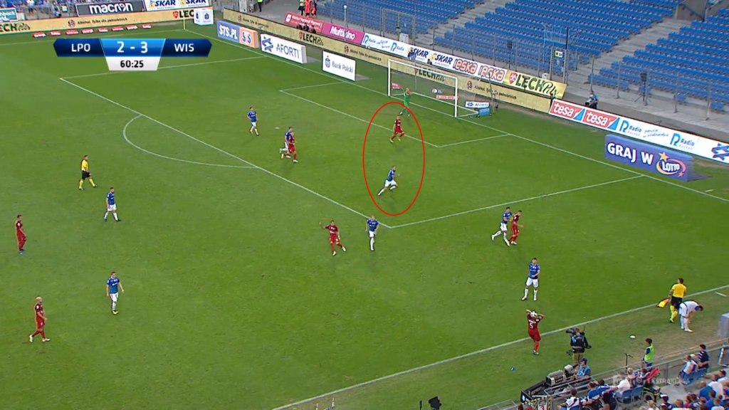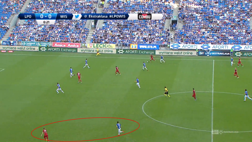 Niestety, wahadłowi „Kolejorza” często stawali się przyczyną problemów. Makuszewski z Jóźwiakiem dają niewątpliwie dużo możliwości w ofensywie, jednak mają problemy pod własną bramką. Z kolei Klupsiowi i Wasielewskiemu brakuje doświadczenia, za to rola De Marco na tej pozycji była jedynie epizodyczna. Na tle kolegów lepiej wypadają Tomasik i Kostewycz, nominalni obrońcy, jednak w ich grze również zauważalne są mankamenty. Wszyscy bywają spóźnieni, w złych momentach dochodzą do rywala, przegrywają pojedynki 1 na 1. W poniższej sytuacji Makuszewski jest spóźniony z kryciem Martina Kostala, co skutkuje pierwszym zagrożeniem pod bramką Buricia w meczu z Wisłą Kraków.