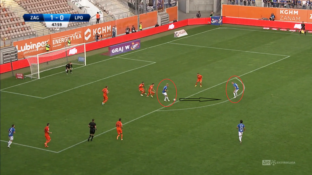 Świetnie było to widać przy golu na 1:1 w meczu z Zagłębiem. Choć formalnie Lech grał w ustawieniu 3-4-3, to zawsze któryś z dwójki Tiba-Amaral cofał się do pomocy i w praktyce stawał się trzecim pomocnikiem w ustawieniu 3-5-2. Tak było przy tej akcji: Amaral się cofnął, Tiba zszedł z piłką do boku, w polu karnym był jedynie Gytkjaer i wtedy do akcji dołączył się Cywka. Tiba zagrał do Gytkjaera, ten miał przed sobą dwóch obrońców, więc oddał piłkę ofensywnemu pomocnikowi, a ten zdobył wyrównującą bramkę.