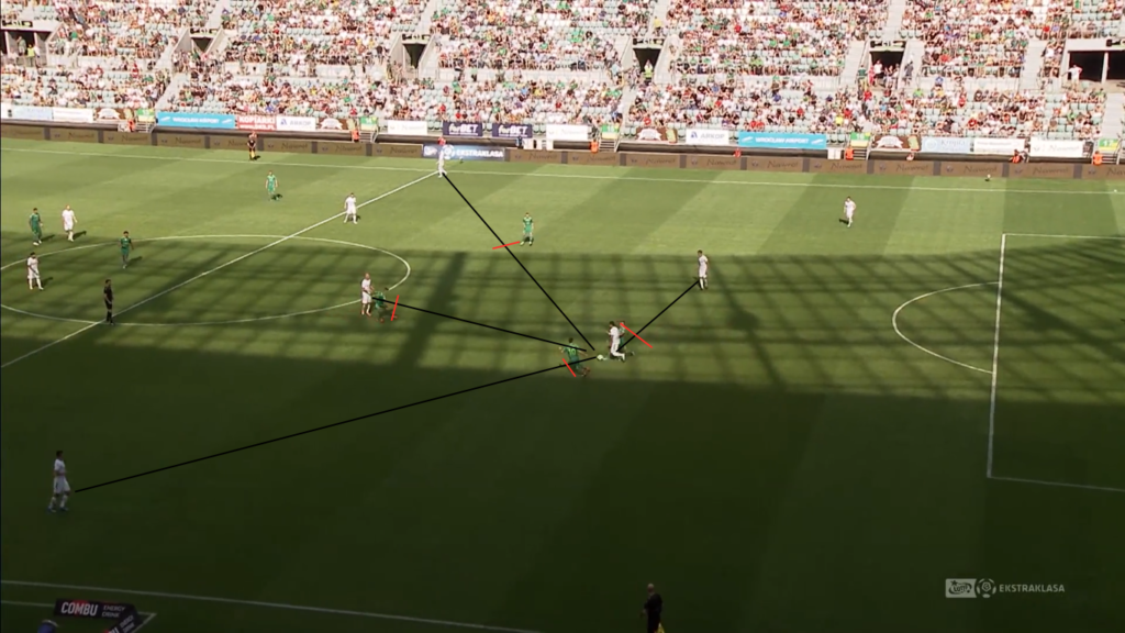 Świetnie wykorzystywało tę słabość rywala Zagłębie Lubin, ustawiając się na własnej połowie, przesuwając formacje i zagęszczając strefę, w której jest piłka. Lechowi brakowało ruchu, brakowało piłkarzy, którzy cofnęliby się do rozegrania i zagrali na jeden kontakt, by wyjść ze swojej połowy. Podobnie sytuacja wyglądała w meczu 3. kolejki Lotto Ekstraklasy przeciwko Śląskowi Wrocław, z tą różnicą, że Śląsk podchodził dużo wyżej od Zagłębia. W tej sytuacji piłkarze Śląska odcięli możliwe drogi podania Vernonowi de Marco, co poskutkowało stratą i dobrą okazją dla wrocławian, którą zmarnował Arkadiusz Piech. Zwróćmy uwagę na to, jak daleko stoją od siebie piłkarze „Kolejorza”, co znacznie utrudnia obrońcom rozegranie piłki.