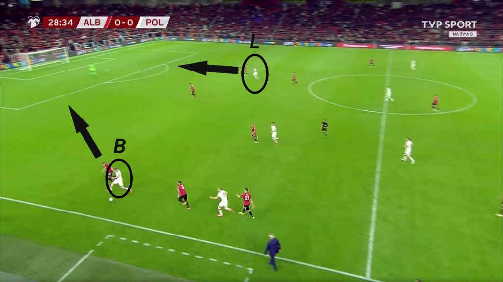 Przy grze obronnej naszej reprezentacji jeden z napastników był bierny i zbierał siły, drugi starał się wspierać obronę w jej pierwszej fazie. Kiedy Albania była głębiej, wtedy zostawał na przedpolu i czekał na przejęcie piłki przez naszych zawodników. Dzięki kilku pressingom Buksy udało się nam szybko odzyskać piłkę i przejść do ataków. Już na wstępie wspomnieliśmy, że na ten mecz przygotowaliśmy głownie ataki w bocznych sektorach. I do nich też przesuwali się nasi napastnicy. Jeden zostawał w środku, a drugi schodził na skrzydło, przez które prowadziliśmy piłkę. Podobnie było przy wysokim pressingu, gdzie jeden podążał do środka, a drugi szedł do strefy rywali prowadzących futbolówkę.