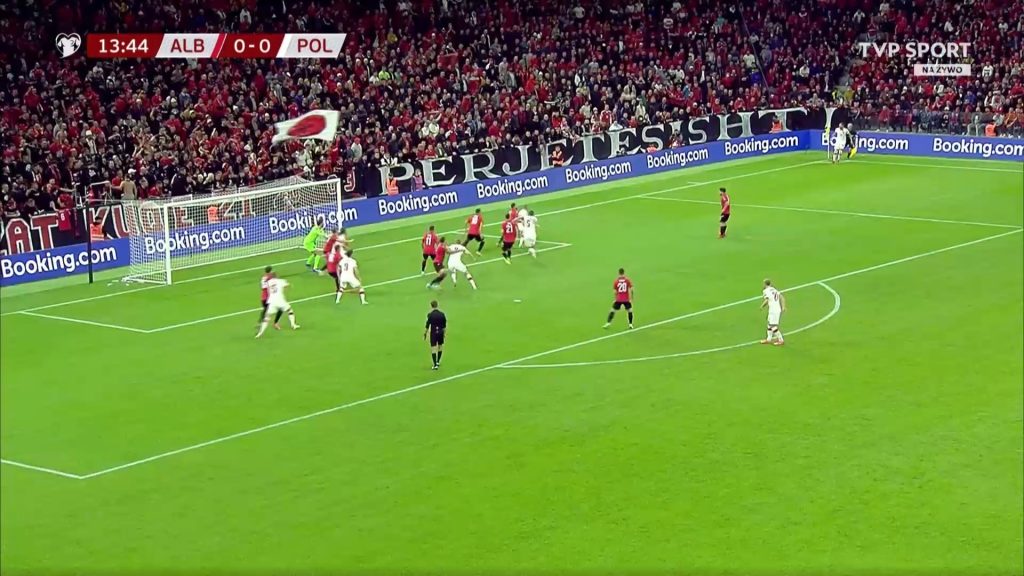 Jedyne miejsce, w którym obaj napastnicy byli blisko siebie, to pole karne rywala przy rzutach rożnych i wolnych. Buksa i Lewandowski atakowali mniej więcej tę samą strefę. Obaj ustawiali się między polem bramkowym a punktem do wykonywania rzutów karnych. Wtedy jeszcze jeden z pomocników stał blisko bramkarza, uniemożliwiając mu wychodzenie do wrzucanej piłki. Nasi snajperzy dobrze potrafią grać w powietrzu, o czym Albańczycy przekonali się już w pierwszym spotkaniu. Niestety w Tiranie nie udało się dojść do dobrego uderzenie z główki, ale Buksa był blisko przy próbie strzału w 14. minucie. Napastnik z MLS oddawał strzał praktycznie na leżąco i strzelił nad bramką.