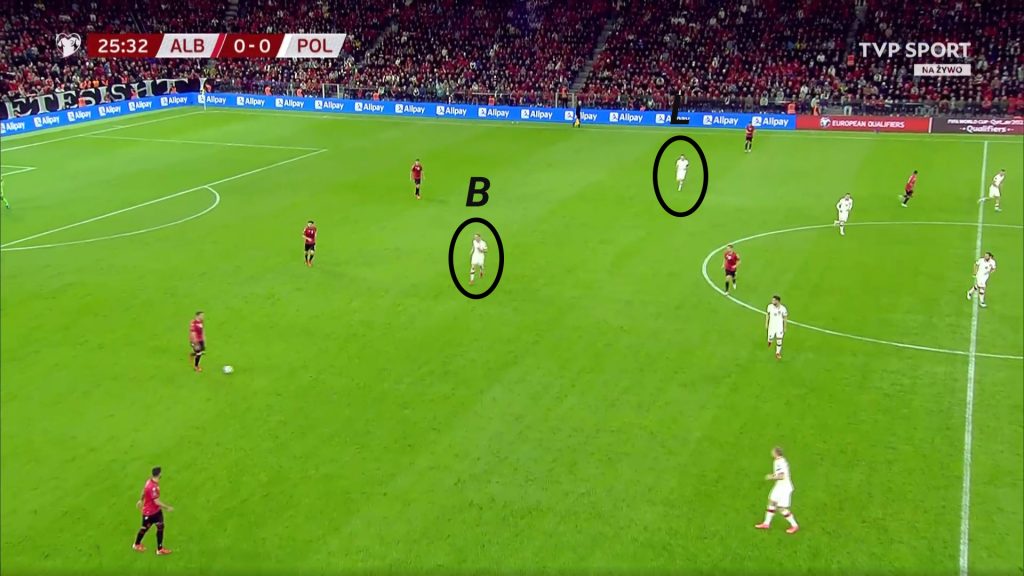 Na Albanię Paulo Sousa przygotował taktykę opartą na grze bokami. Można było przewidzieć, że środek zostanie zamurowany przez gospodarzy i trudno będzie przebijać się w tej strefie do ataków. Jakub Moder, a później Mateusz Klich wspierali w bocznych sektorach wahadłowych. Zadaniem napastników było przechwycenie długiej piłki, schodzenie do boków lub do środka po piłkę oraz wykorzystywanie wolnych przestrzeni w momencie, kiedy akcja przesuwała się do lewej lub prawej strony.