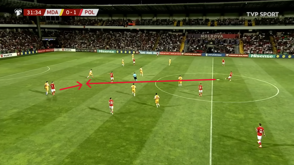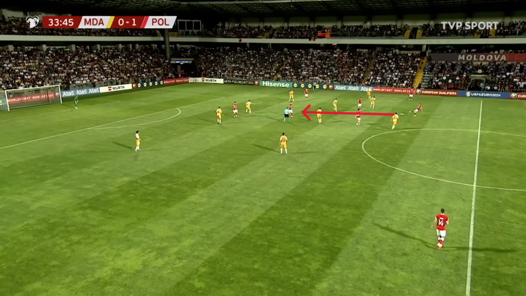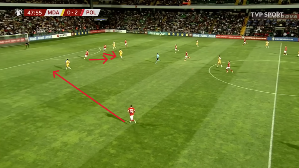 Trzeba jeszcze raz podkreślić, że nasi napastnicy wyglądali w tym spotkaniu bardzo dobrze. Poniżej widzimy sytuację, w której po wybiciu piłki z rzutu rożnego dochodzi do niej Zieliński i podejmuje bardzo szybko decyzję o dośrodkowaniu. Świetnie zrozumiał się z Robertem Lewandowskim, który wykonał bardzo dobry ruch do piłki, zgrał ją do Milika i w ten sposób w Kiszyniowie padła pierwsza bramka.