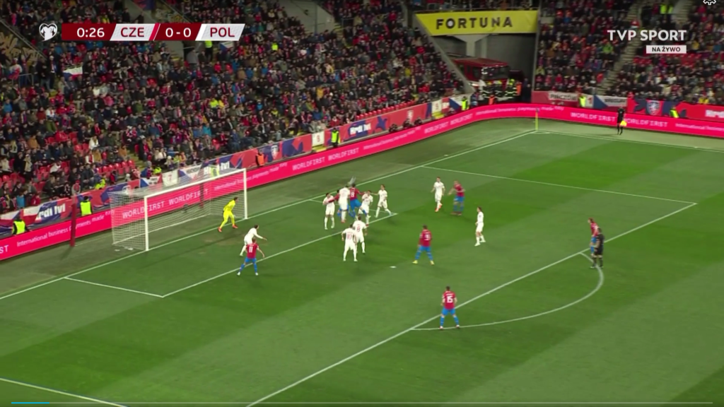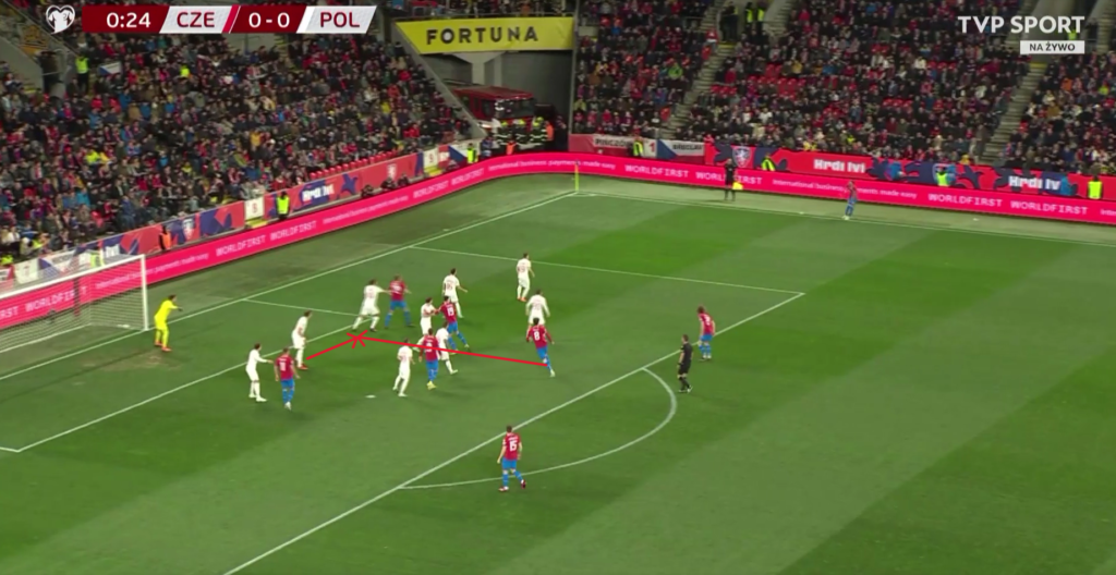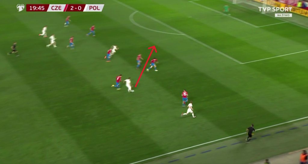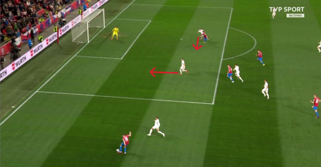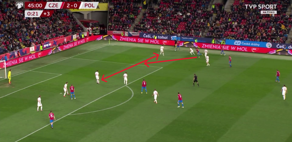 Dwójka czeskich napastników doskakiwała do środkowych obrońców, a pomocnicy odcinali rozegranie piłki do środka pola. Natomiast skrzydłowi czyhali na podanie do wahadłowych celem szybkiego doskoczenia. Dlatego częstym rozwiązaniem były długie crossy do boków boiska, bez większych efektów. W poniższej akcji dziesięć sekund później Jakub Kiwior posłał długą piłkę na prawe skrzydło, do której adresat nie dotarł.
