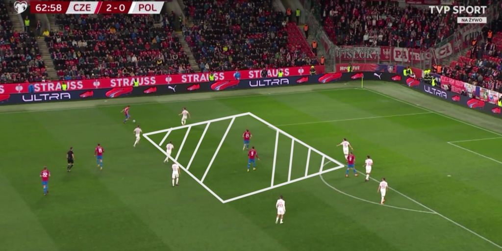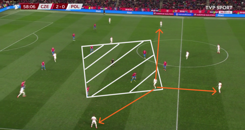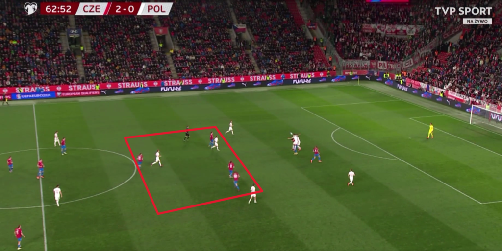 Czy po tych ciosach Polacy próbowali rzucić się do ataku? Nie do końca. Czesi byli bardzo dobrze zorganizowani, mądrze bronili i nie dopuszczali „Biało-czerwonych” do groźniejszych sytuacji. Popatrzcie na jeden z wielu obrazków z tamtego spotkania, który idealnie obrazuje to, że choć Polacy wymienili blisko dwa razy więcej podań w ciągu meczu, to nic z tego nie wynikało.