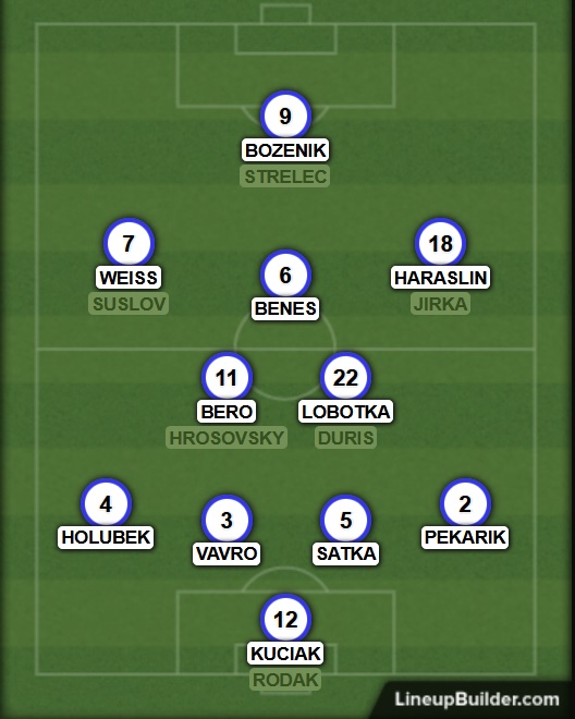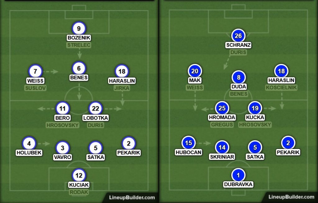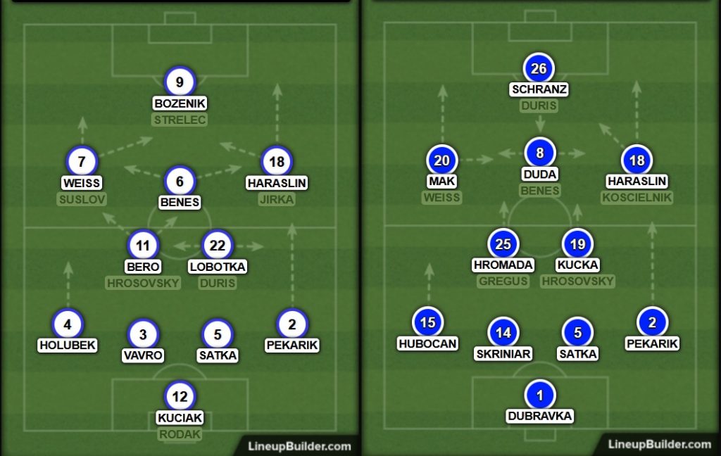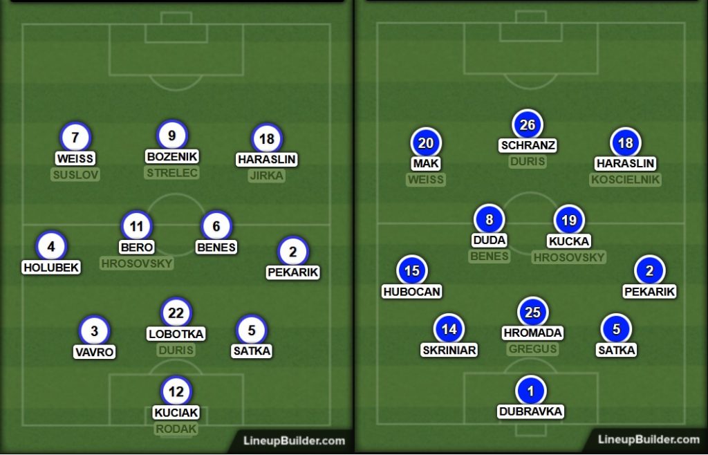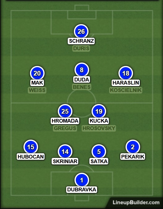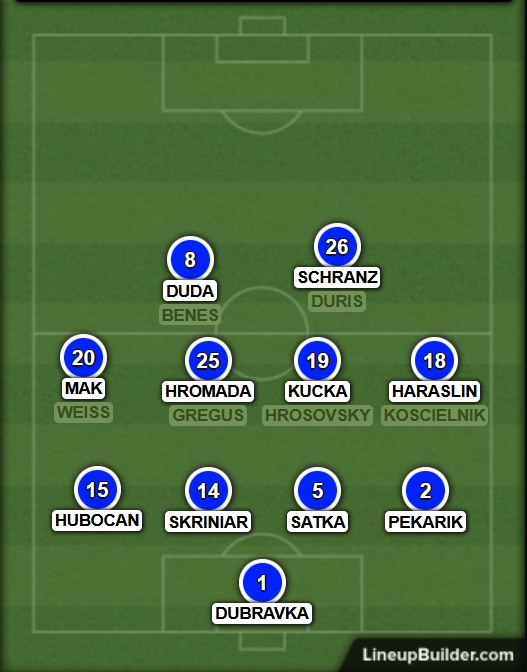 Dubravka – Hubocan, Skriniar, Satka, Pekarik – Lobotka, Kucka – Weiss, Duda, Haraslin – Duris